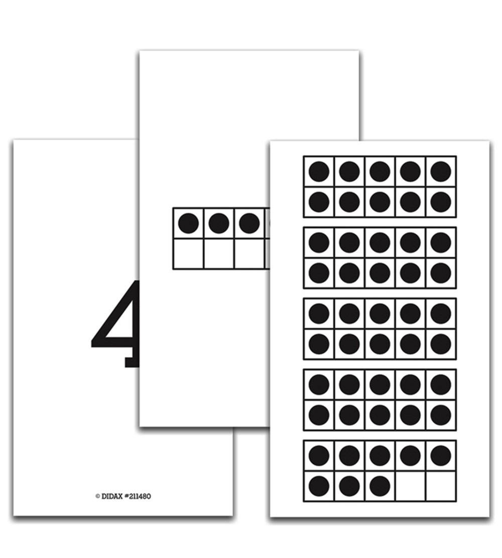 Set of 50 (3.5" x 6" ) cards showing ten-frames to 50; with ten-frames on front and number on reverse.