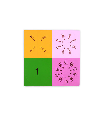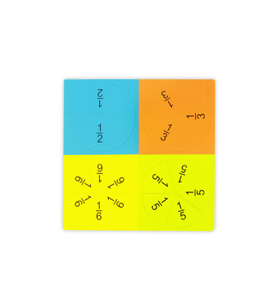 These colorful magnets represent fractions in two different ways: circular to show groups, and rectangular to show lengths as parts of a whole.