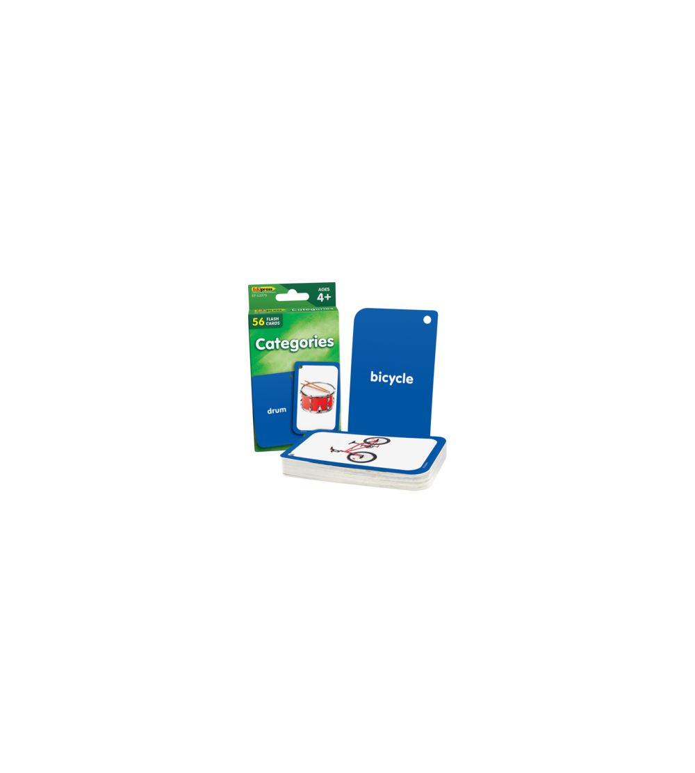 Identify and review grouping 55 different words into multiple categories, individually, in groups, or with the whole class! Flash card set contains a collection of full-color, high-interest student cards as well as instructions and tips for the teacher or parent, suggested activities, and additional blank cards. Each card has a hole in the top corner that can be fit with a ring or string to help with organization and storage. Additionally, each card has one corner that is shaped differently than the others. By lining up the non-rounded corners, the flash cards can quickly be faced in the same direction. When applicable, flash card sets include answers in small print on the reverse side of each card. Each card measures 3⅛" x 5⅛". 56 double-sided cards per pack.