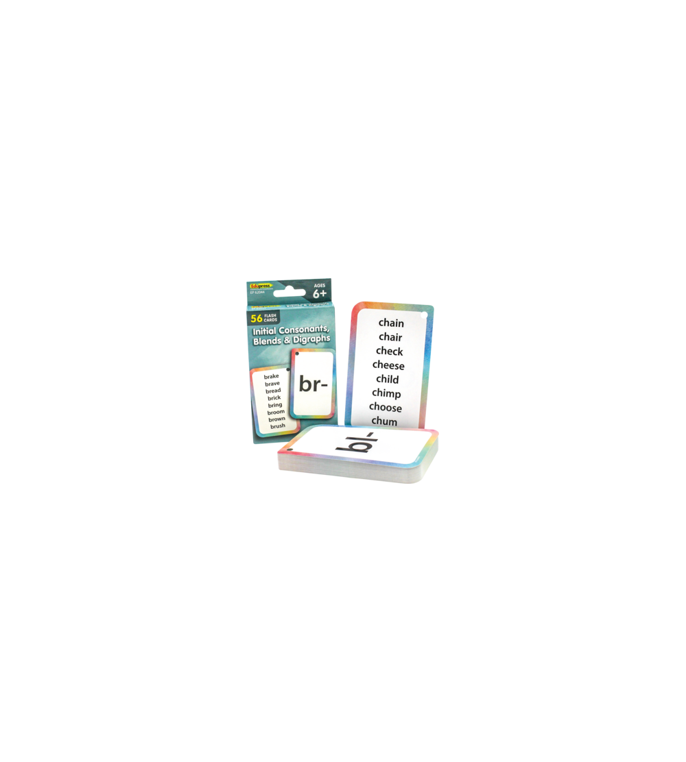Teach and review initial consonants, blends, and digraphs with these full-color flash cards! Each set contains instructions and tips for the teacher or parent, along with suggested activities. Each card has a hole in the top corner for use with a ring or string to help with organization and storage. Additionally, each card has one corner that is shaped differently than the others. By lining up the non-rounded corners, the flash cards can quickly be faced in the same direction. Each card measures 3⅛" x 5⅛". 56 double-sided cards per pack.