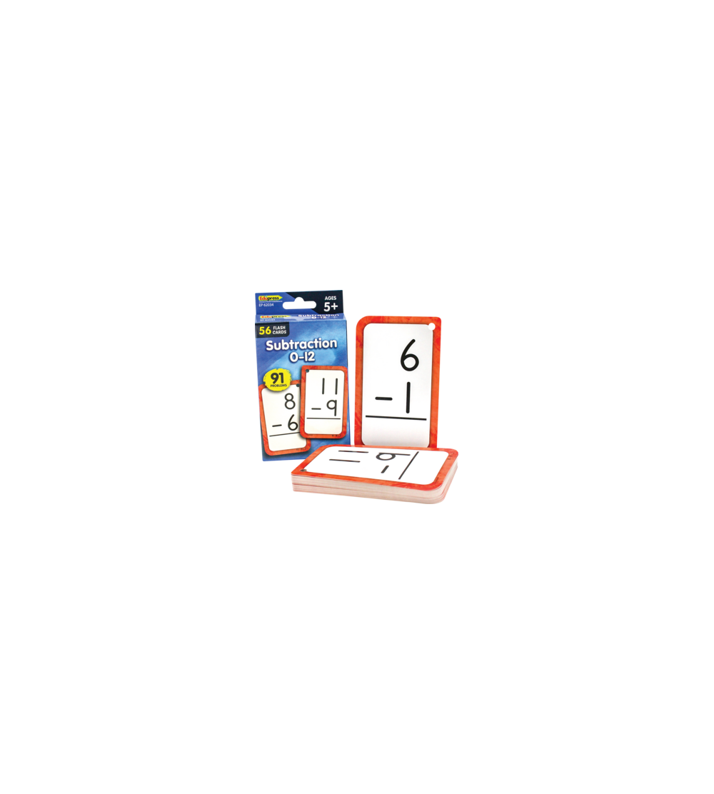 Learn subtraction facts from 0–12 with these math flash cards! Featuring 91 subtraction facts ranging from 0–0 to 12–12, these cards make finding the difference a skill any student can master. Lining up the non-rounded corners makes it easy to put all of the cards in the correct direction and organize them. 56 double-sided cards per pack. Each card measures 3⅛" x 5⅛".