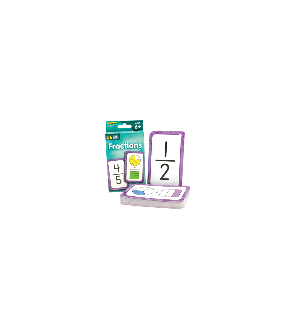 Give students the support they need when learning fractions with these flash cards, featuring a fraction in numerical and picture form. Every set contains a collection of full-color, high-interest student cards, as well as instructions and tips for the teacher or parent, along with suggested activities. Each card has a hole in the top corner for use with a ring or string to help with organization and storage. Additionally, each card has one corner that is shaped differently than the others. By lining up the non-rounded corners, the flash cards can quickly be faced in the same direction. Each card measures 3⅛" x 5⅛". 56 double-sided cards per pack.