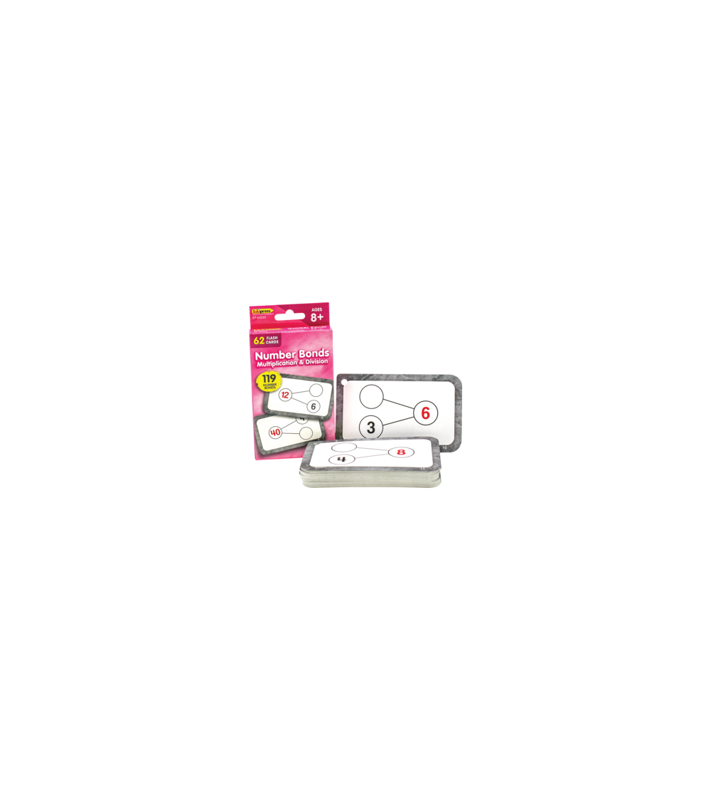 Master multiplication and division math facts simultaneously with these number bond flash cards. Every set contains a collection of full-color, high-interest student cards, as well as instructions and tips for the teacher or parent, along with suggested activities. Each card has a hole in the top corner for use with a ring or string to help with organization and storage. Additionally, each card has one corner that is shaped differently than the others. By lining up the non-rounded corners, the flash cards can quickly be faced in the same direction. Each card measures 3⅛" x 5⅛". 56 double-sided cards per pack.