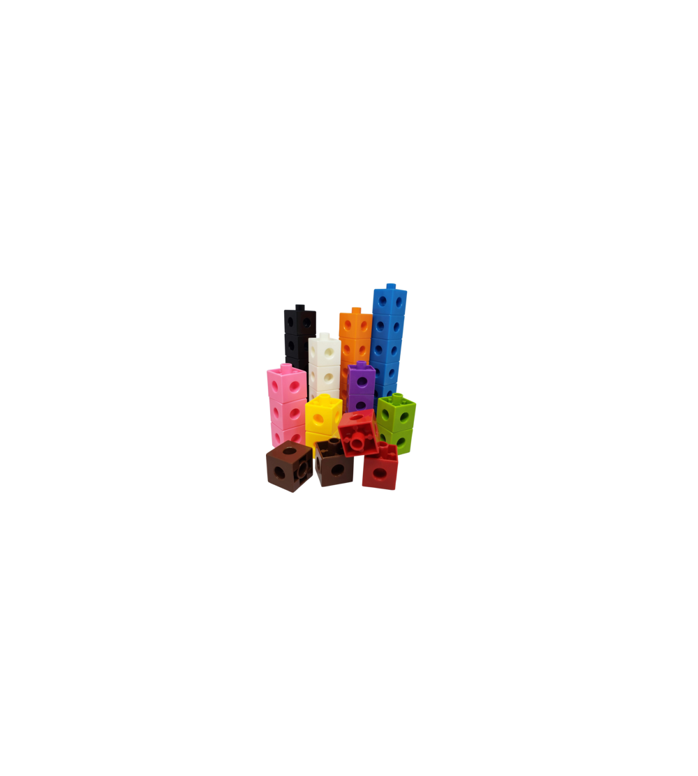 Explore spatial relationships using plastic cubes that link together on all sides. Great for counting, sorting, measuring, and graphing. 100 plastic cubes in 10 colors: 10 each of white, yellow, orange, pink, red blue, green, purple, brown, and black. 3/4" cubes. Includes suggested activities.