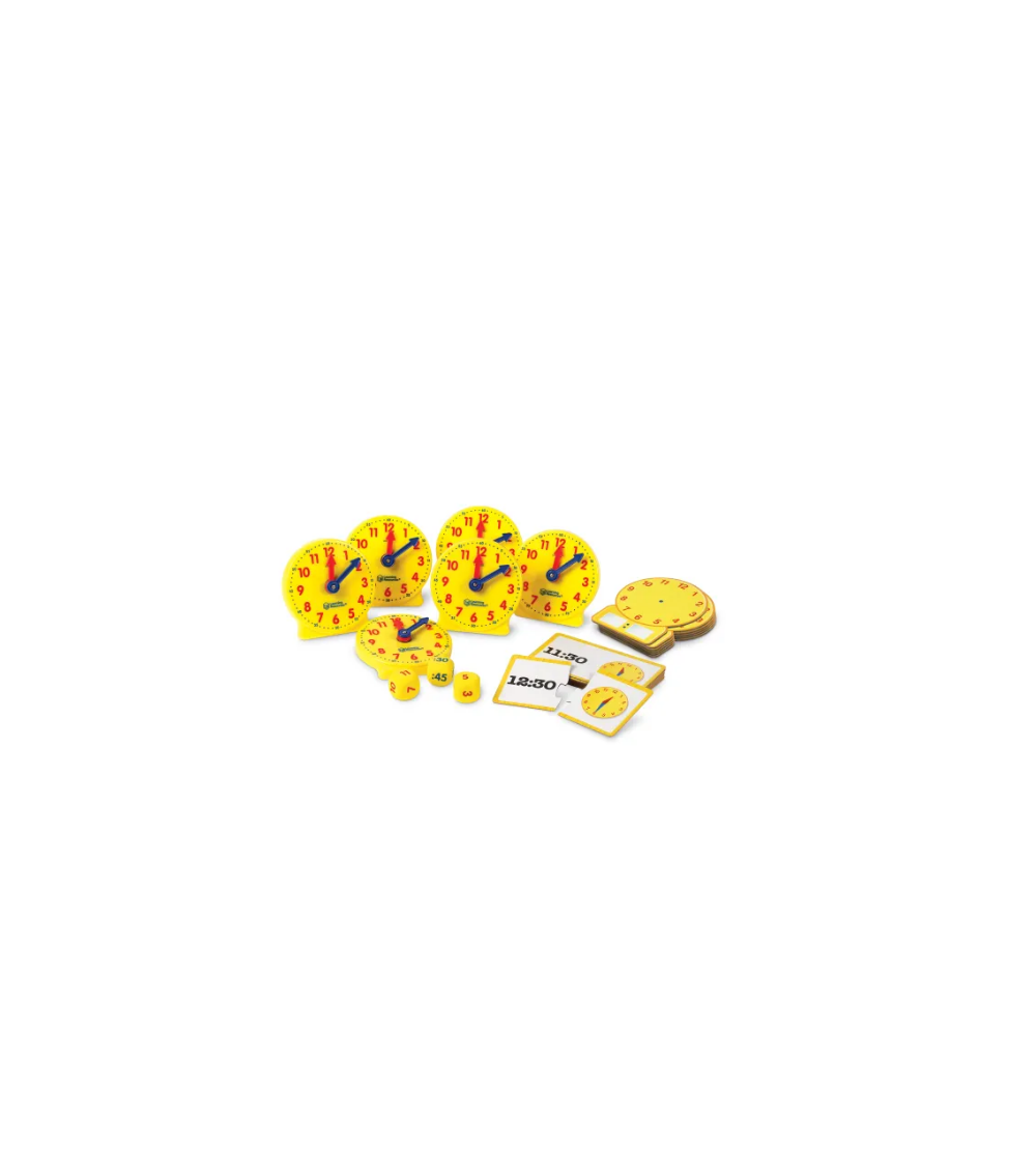 It's time to tell time! Help your class master analog time-telling skills with the About Time! Small Group Activity Set. Inspired by our original Big Time Student Clocks, this classroom clock set features everything you need to turn learning to tell time into a game-like small-group activity. The About Time! Small Group Activity Set includes 12 clocks in total: 6 plastic mini clocks with movable second and minute hands, and 6 write-and-wipe teaching clocks that help students learn through hands-on drawing. In addition, About Time! Small Group Activity Set also includes 24 double-sided time cards and 3 time dice, as well as an activity guide filled with suggestions for how to get the most out of this classroom clock set. Lead simple lessons on the motion of a clock's hands, or roll the dice, call out a time, and have your students set the mini clocks themselves. The About Time! Small Group Activity Set makes learning time skills simple and fun.