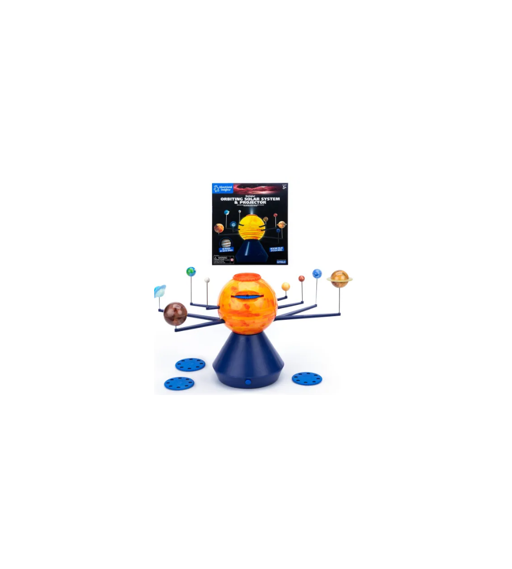 This Orbiting Solar System & Projector features moving planet models that orbit the Sun at different speeds. Toggle between orbiting and static with the click of the button, then turn on the Sun-shaped projector to view high-quality images of stars, planets, asteroids, and more outer space objects; the projector even includes some photos from NASA! The model is easy to assemble, just pop the planet model onto the arm, click the planet arm into the Sun and you’re ready to observe!