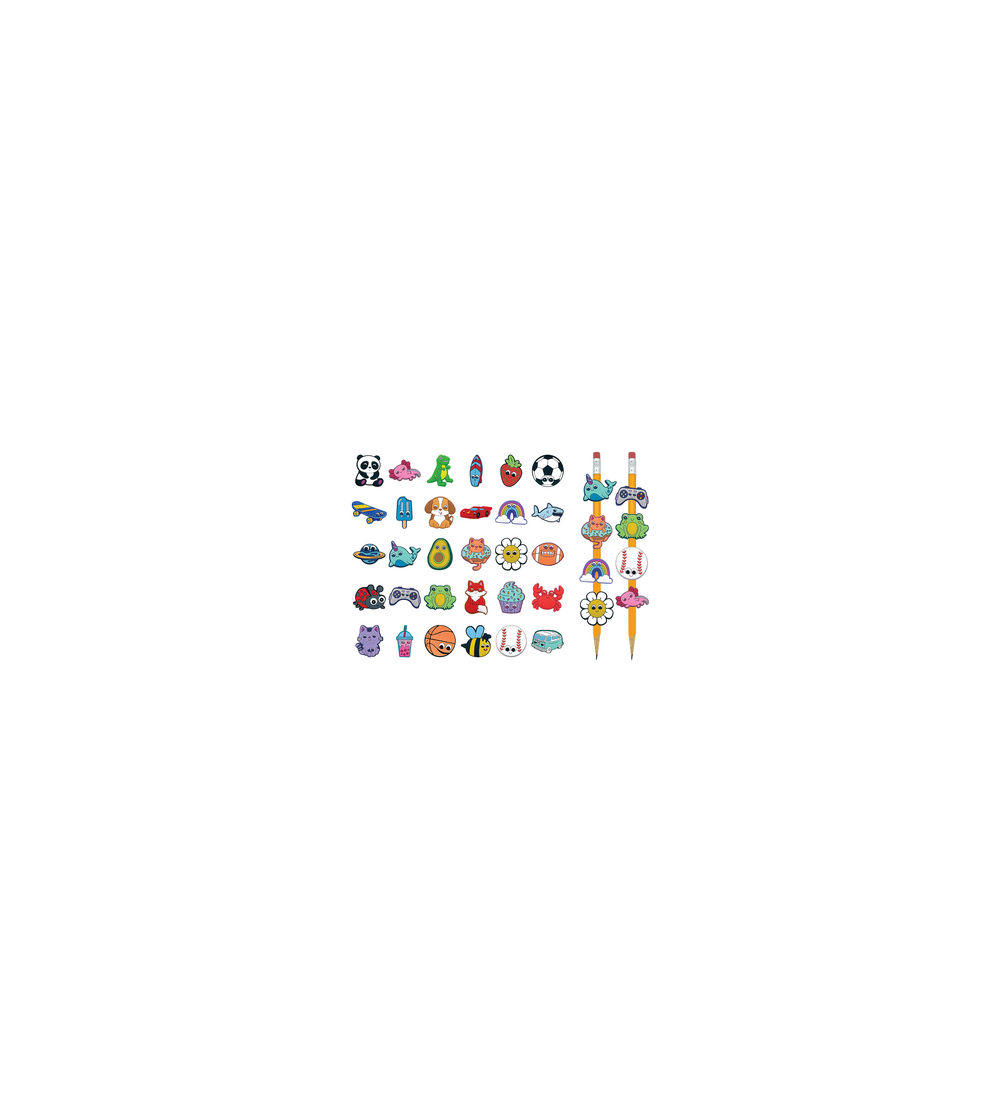 These pencil charms are perfect for classroom incentives, achievement awards, treasure chest prizes, or just for fun! These soft and flexible pencil charms attach with a small clip to any standard-sized pencil, pen, or even drinking straw. The collection includes 30 different designs, so there's something to appeal to every kind of student. Pack features 60 pieces total. Each piece measures approximately 1-1/4" x 1-1/4".