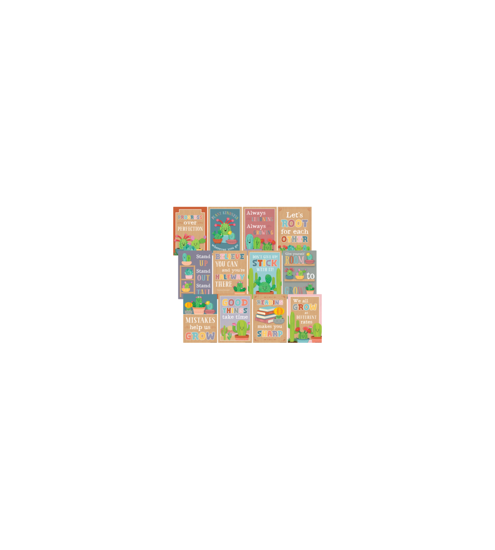 Create a nurturing and inspiring classroom environment with this charming collection of posters featuring colorful cacti and uplifting messages. Perfect for fostering growth mindsets and positivity, these posters add a warm and encouraging touch to any space. Pack includes 12 posters, each poster measures 11" x 15¾".