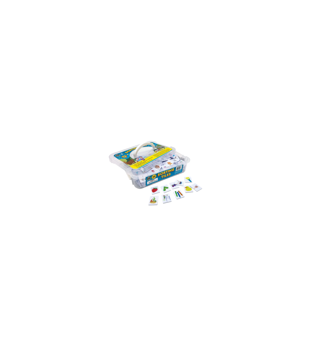 This collection of 450 plastic tiles provides endless learning opportunities. Each tile is printed with a unique image that can be sorted or organized into an infinite number of groups or categories. Young learners can separate the images by shape or color, while older learners can place the images into categories by theme, spelling, or word sound. Each tile includes an easy-to-identify illustration from such categories as food, animals, sports, toys, colors, numbers, shapes, tools, nature, occupations, weather, and more! Additionally, one-sided printing allows the tiles to be arranged facedown for memory and matching activities. A book with activity suggestions is included, but the possibilities for learning are endless!