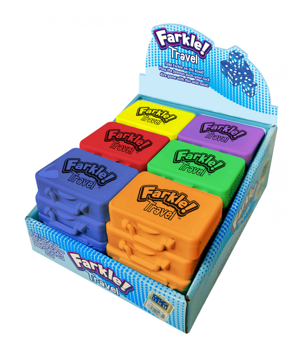 Farkle! Travel in assorted colored boxes with matching colored dice. Dice are standard sized 16mm size. Includes 24 units per display, four of each color. Brand: Continuum Games | Keywords: Dice Game On the Go | Players: | Ages: