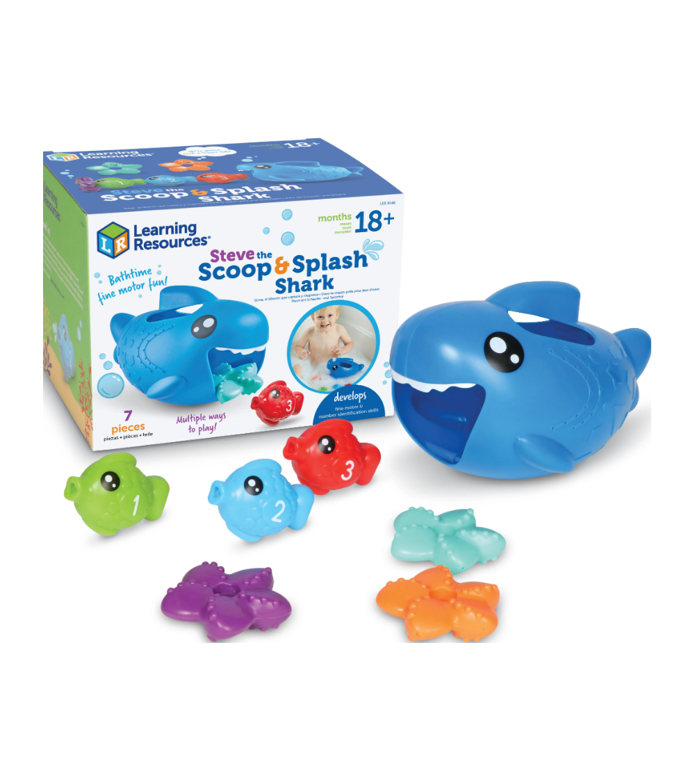 This baby shark is ready for bathtime fun! Explore this set’s versatile activities—scoop up the fish with the mini shark scoop, fill your shark with water and pour it out his mouth, or snap the fish together as you count from 1-5. The shark’s hinged tail even swims back and forth as he moves through the water. Pieces store inside shark for easy cleanup.