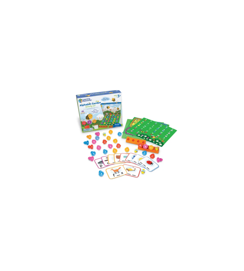 In this garden, we grow new letter skills! Kids can explore the alphabet with this set of 26-letter flower counters and interchangeable double-sided playset. Spell simple words, sort by color, match letters and beginning sounds, and more. Includes friendly bees for sequencing activities. Pieces store inside for easy cleanup!