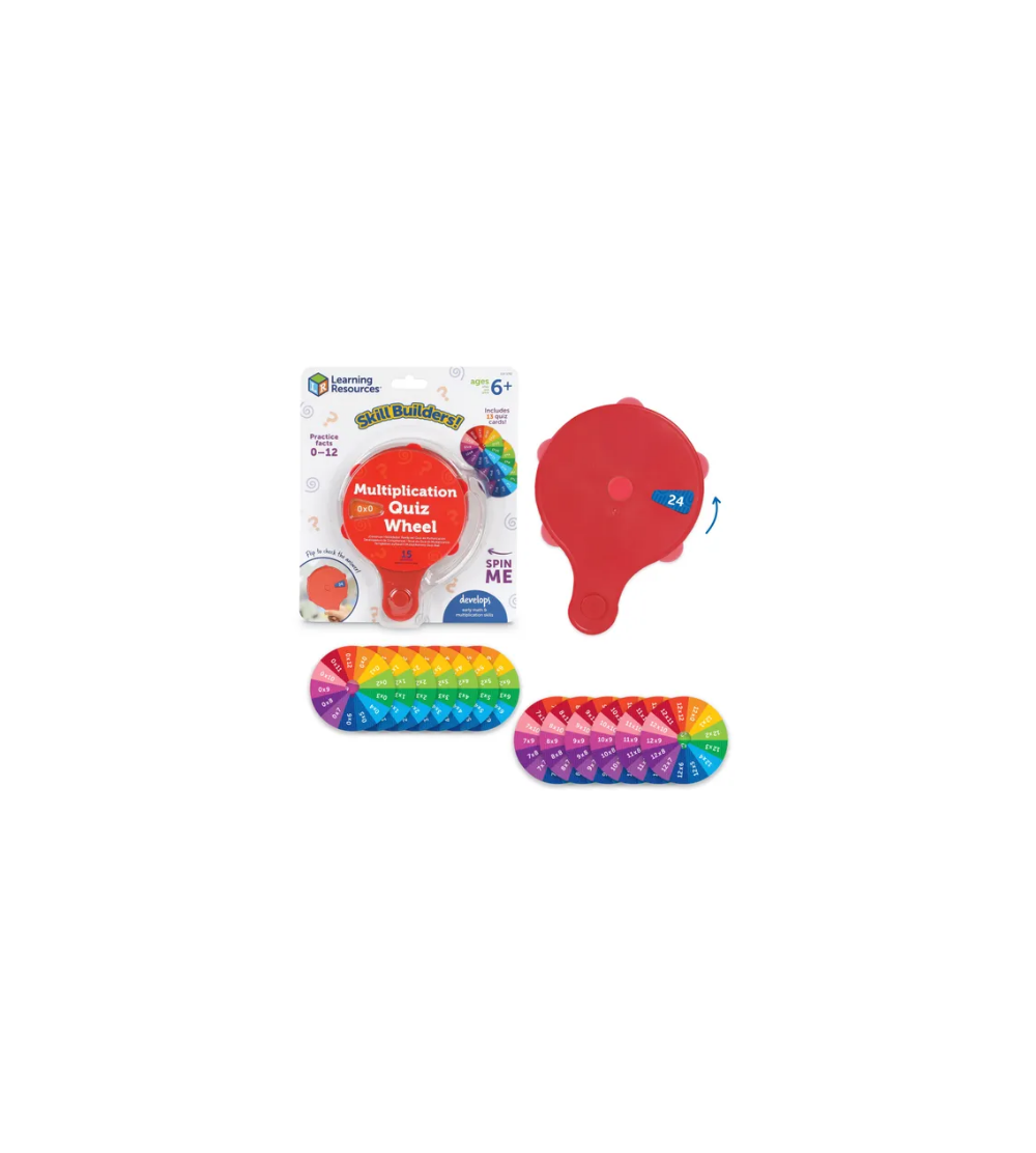 Take new math skills for a spin with this handheld learning wheels! Kids can pop in a card, spin to an equation, then flip to check the answer. This set includes 13 cards—with one for facts 0-12, it’s an all-in-one way to practice the multiplication table. Cards store on the back of the wheel for easy cleanup and on-the-go learning. Age 6+ | Grade 1+