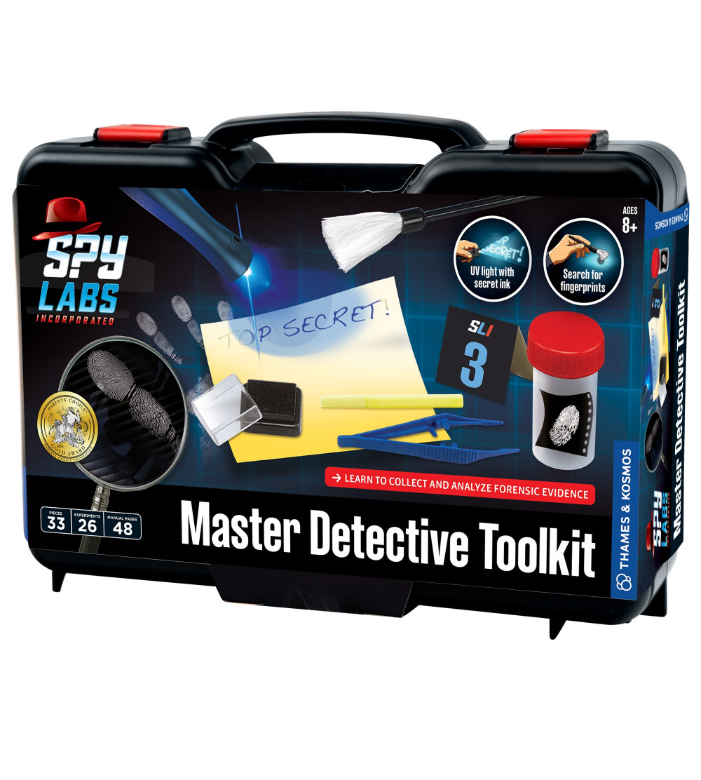 Welcome to Spy Labs Incorporated, the one-stop shop for spies on the top! With this well-equipped toolkit, you can learn how detectives use forensic science to answer questions, gather evidence, and solve crimes. Experiment with the equipment and techniques used by real detectives to develop your own observation and problem-solving skills. First, you will set up your detective’s office and organize your tools. Then, you will do some exercises to hone your observation skills. Next, you will learn about securing a crime scene, and gathering and documenting evidence, including fingerprints, footprints, and tire tracks. After you have gathered evidence, such as hair and fibers, counterfeit currency, and soil samples, you will head back to the lab to learn how to analyze it. Finally, you can try your hand at deciphering codes, writing messages with invisible ink, and communicating with secret symbols. As your skills develop, you can use them to solve the practice cases.