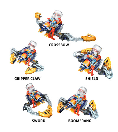 Once assembled, wear the cyborg blaster on your own hand. Press one trigger to shoot a stream of water from the blaster nozzle using a hydraulic piston. Press another trigger to activate the claw mechanism. The claw transforms into many different shapes — in addition to the gripper claw, it can take on a shield, sword, crossbow, and boomerang shape.